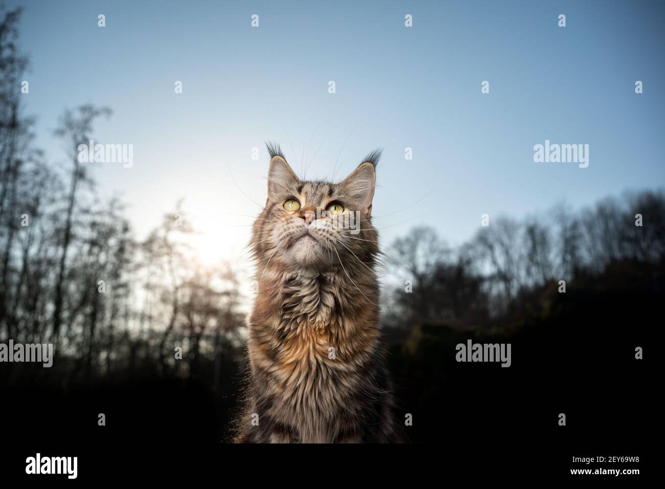 Beautiful Maine Coon Cat Looking Up In The Sky On Sunny Day With Treeline Of Forest In The Background And Copy Space Stock Photo Alamy